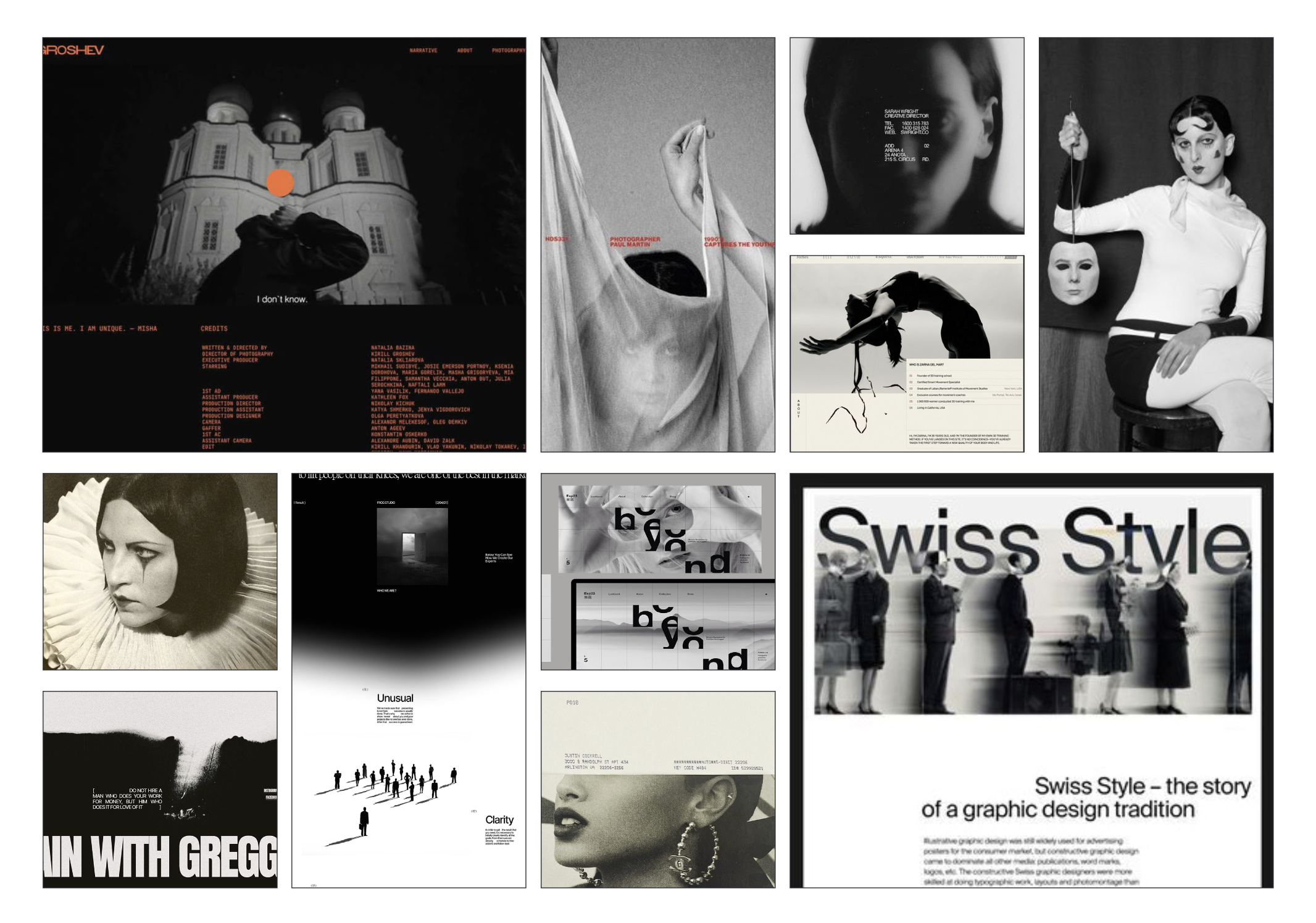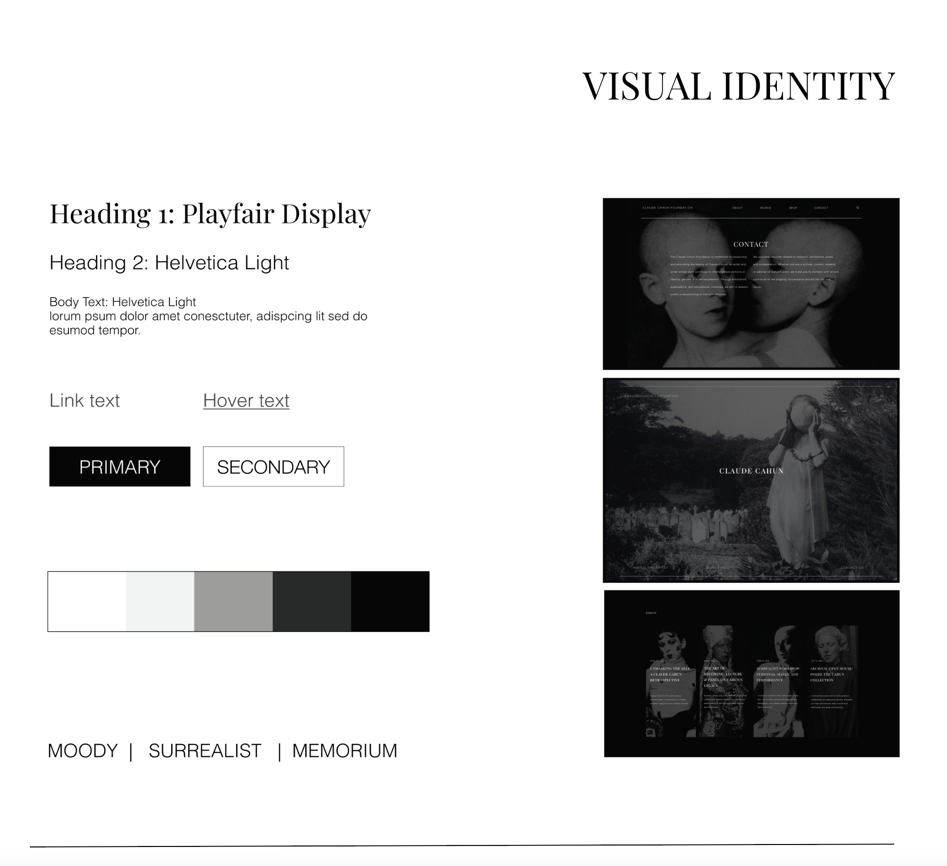 The visual identity is refined and bold. The black-and-white color palette allows the images to blend into the rich background and allows the surrealist imagery to be central. It also provides a sense of reverence and a memorial, elaborating on the website's purpose.